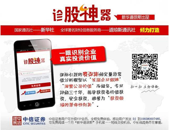 想聽見股市花開的聲音么?掃描圖片中二維碼,即刻關注“新華道瓊斯”微信服務號!輸入股票代碼,秒查個股投資財務安全評級!
