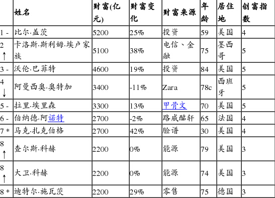 全球十億美金富豪增加222人,達到2089人,歷年最高。