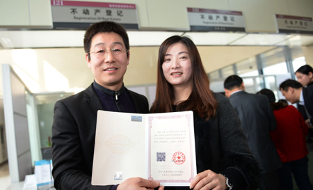 3月1日,《不動產登記暫行條例》開始施行。國土資源部部長姜大明在江蘇徐州市為申請領證的市民頒發了全國第一本不動產權證書。圖為當日在江蘇徐州市不動產登記交易服務中心,市民邢衛鋒、趙媛媛夫婦在展示編號為001的不動產權證書。