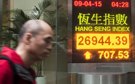4月9日,一名行人從香港灣仔一家銀行的恒生指數(shù)電子顯示屏前走過。 當(dāng)日,港股承接強(qiáng)勢,收市報(bào)26944.39點(diǎn),全日升707.53點(diǎn),升幅2.7%。主板成交再創(chuàng)歷史新高,達(dá)2915億港元。“港股通”單日額度再次用盡,比前一交易日提早23分鐘。