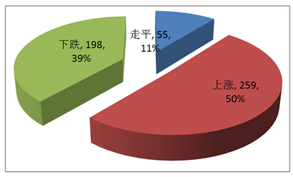 本季度監測,512個代表品種中,一季度價格指數上漲的有258種,占比50.4%;價格下跌的有199種,占比38.9%;價格不變的有55種,占比為10.7%。從數據上看上漲品種明顯高于走跌品種,進一步印證了本季度指數呈現上升的走勢。品種漲跌如圖4所示。