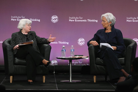 當(dāng)?shù)貢r間5月6日,美國首都華盛頓,國際貨幣基金組織總裁拉加德(右)和美聯(lián)儲主席耶倫出席對話活動。 耶倫表示,盡管低利率環(huán)境容易導(dǎo)致金融冒險(xiǎn)活動增加,但目前美國金融穩(wěn)定風(fēng)險(xiǎn)仍處于溫和水平,沒有明顯提升。