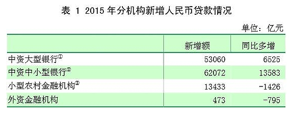 2015年末,金融機(jī)構(gòu)本外幣貸款余額為99.3萬億元,同比增長13.4%,與上年末基本持平,比年初增加11.7萬億元,同比多增1.3萬億元。人民幣貸款余額為94.0萬億元,同比增長 14.3%,比上年末高0.6個百分點,比年初增加11.7萬億元,同比多增1.8萬億元。從人民幣貸款部門分布來看,住戶貸款、非金融企業(yè)及機(jī)關(guān)團(tuán)體貸款增長略有加快,非銀行業(yè)金融機(jī)構(gòu)貸款增多。2015年末,住戶貸款余額為27.0萬億元,同比增長 16.8%,增速比上年末高0.2個百分點,比年初增加3.9萬億元,同比多增5814億元。其中,個人住房貸款比年初增加2.5萬億元,同比多增9250億元。非金融企業(yè)及機(jī)關(guān)團(tuán)體貸款余額為65.8萬億元,同比增長12.7%,增速比上年末高0.2個百分點,比年初增加7.4萬億元,同比多增8987億元。非銀行業(yè)金融機(jī)構(gòu)貸款余額為8539億元,同比增長 66.9%,比年初增加3767億元,同比多增2605億元。從期限看,中長期貸款比年初增加6.7萬億元,同比多增6332億元,增量占比為57.1%。包含票據(jù)融資在內(nèi)的短期貸款比年初增加4.7萬億元,同比多增1.2萬億元;其中,票據(jù)融資比年初增加1.7萬億元,同比多增7062億元。分機(jī)構(gòu)看,中資大型銀行和中資中小型銀行貸款同比多增較多。