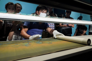 ??? 北京故宮博物院2017年的年度大展——《千里江山——歷代青綠山水畫特展》9月15日在午門展廳和東西雁翅樓開展。展覽以北宋王希孟的《千里江山圖》為中心,系統梳理、展示中國歷代青綠山水畫的發展脈絡。圖為故宮博物院的工作人員將《千里江山圖》布置到展柜中。記者 沈伯韓 攝 |