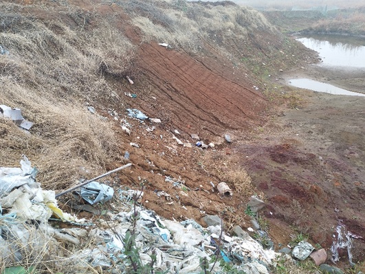 這是在安徽省銅陵市義安區(qū)一處長江堤壩內(nèi)的傾倒點(diǎn),凹處呈紅褐色,旁邊隨處可見白色垃圾,刺鼻的氣味隨風(fēng)飄來。記者采訪了解到,去年5月,有人非法將62.88噸危險(xiǎn)廢物——酸洗污泥從浙江嘉善運(yùn)到安徽,傾倒在這里。記者 姜剛 攝