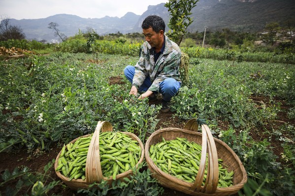 畢節市黔西縣大關鎮村民在扶貧基地內采摘豌豆。新華社發(周訓超 攝)