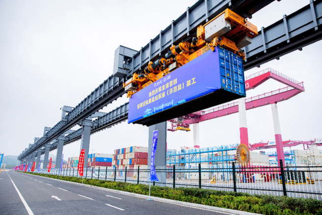 ????今年6月,全球首創智能空中軌道集疏運系統(示范段)在山東港口青島港自動化碼頭竣工投入試運營。資料照片