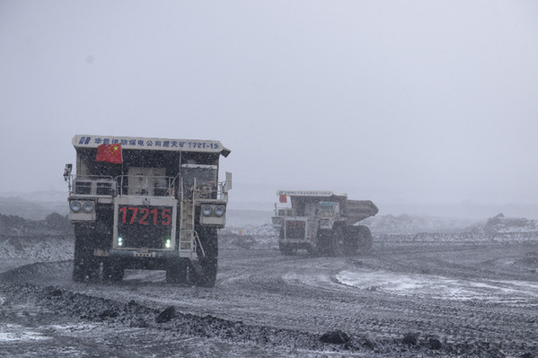 ????華能伊敏露天礦自卸卡車風雪中保煤炭運輸。資料照片