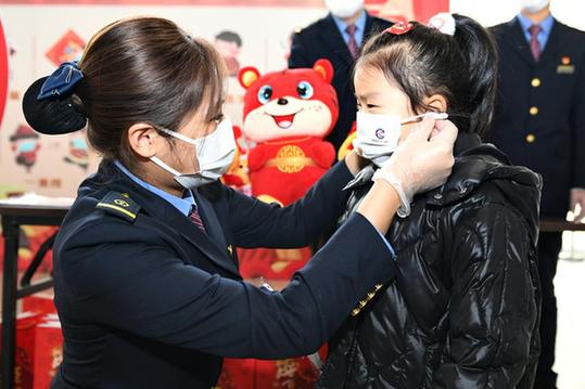 1月16日,在常州站候車室防疫宣傳活動現場,鐵路工作人員為候車小朋友戴好口罩。新華社發(史康 攝)