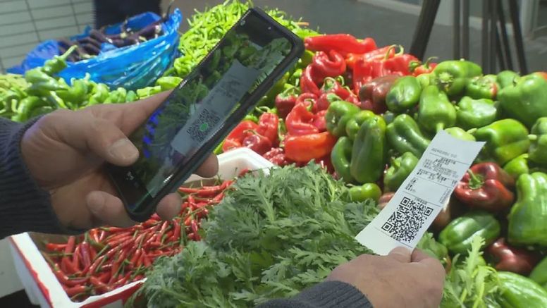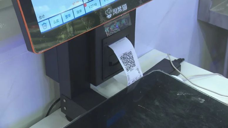 值得關注的是,在完成每次交易后,每個攤位的智能秤都會吐出一張收銀條,上面不僅有交易明細,還有一個二維碼,掃一掃即可完成每件商品的溯源,而墻上這臺實時滾動的電子屏也能讓菜場、攤販和顧客對于各類購物信息和數據一目了然。