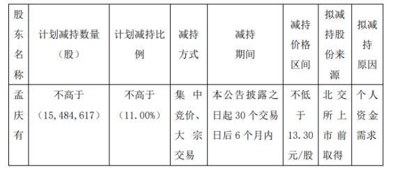 公告顯示,股東孟慶有持有2227.45萬股公司股份,持股比例15.82%,當前持股股份為北交所上市前取得。因個人資金需求,孟慶有擬減持不超1548.46萬股公司股份,減持方式為集中競價、大宗交易;減持期間為本公告披露之日起30個交易日后6個月內。