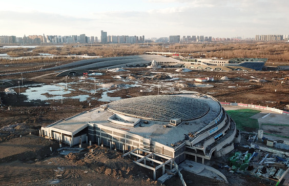 這是4月12日拍攝的哈爾濱冰雪大世界四季冰雪項目施工現場(無人機照片)。