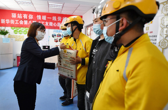 4月28日,寧夏銀川市興慶區(qū)新華街工會(huì)工作人員為職工送上“心愿禮物”。