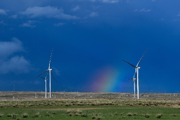 這是6月26日在青海省海南藏族自治州共和縣拍攝的風力發電機。