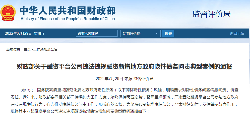 記者7月29日從財政部了解到,為切實嚴肅財經紀律,堅決遏制新增地方政府隱性債務,財政部從已完成問責的隱性債務案例中,選取了八起融資平臺公司違法違規融資新增隱性債務問責典型案例進行公開曝光。