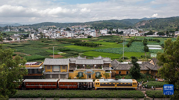 游客在云南省建水縣乘坐米軌小火車來到鄉會橋站游覽(2022年7月1日攝,無人機照片)。新華社記者 胡超 攝