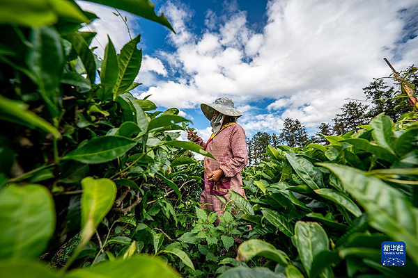 茶農在位于云南省西雙版納傣族自治州勐??h的國家種質大葉茶樹資源圃采茶(2022年5月10日攝)。新華社記者 江文耀 攝