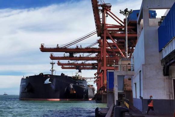 近日,承載廣西供應鏈服務集團進口的5.72萬噸菲律賓鎳礦的貨輪,靠泊在山東嵐橋港并卸貨。資料照片