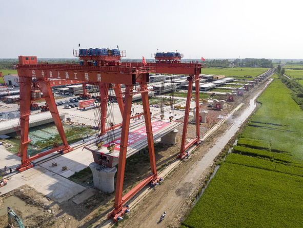8月25日拍攝的滬渝蓉高鐵天門段首榀箱梁架設現場(無人機照片)。新華社記者 熊琦 攝