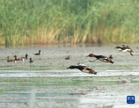 這是在河北白洋淀淀區拍攝的青頭潛鴨與白眼潛鴨混群(2022年7月22日攝)。新華社記者 邢廣利 攝