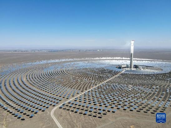 在新疆伊吾縣淖毛湖鎮拍攝的哈密50兆瓦熔鹽塔式光熱發電站(2021年8月22日攝,無人機照片)。作為新疆第一座光熱發電站,哈密50兆瓦熔鹽塔式光熱發電站不僅污染物零排放,還通過儲存熱能實現24小時持續發電。新華社記者 高晗 攝