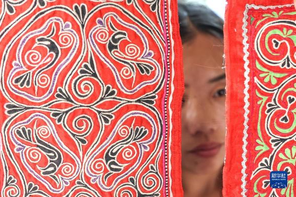 村口一家苗繡車間中,27歲的苗族姑娘楊文麗正帶著繡娘們飛針走線,趕制頗具苗族特色的旅游文創產品,一幅9米長的苗繡長卷即將完工。長卷畫面上,錯落有致的民居掩映在青山綠水間,身著少數民族服飾的村民們載歌載舞。