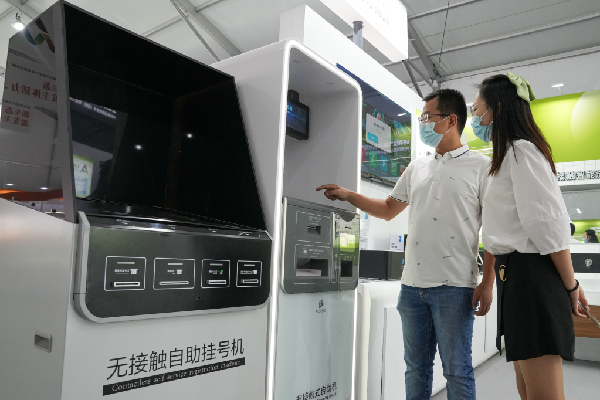 2022年9月15日,在2022年全國大眾創業萬眾創新活動周合肥主會場的主題展區中,參展人員體驗非接觸式自助機。新華社記者 杜宇 攝
