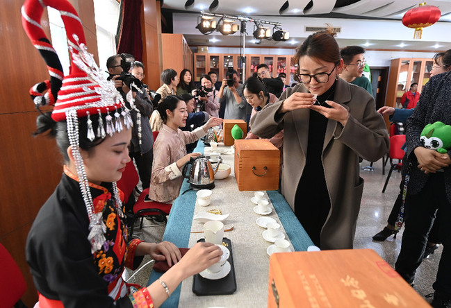4月25日,媒體記者、與會嘉賓在茶文化節新聞發布會后品嘗、了解高山白茶。