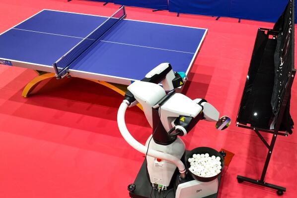圖為7月22日在成都高新體育中心多功能館拍攝的乒乓球訓練機器人。該設備通過模擬人體動作發球,方便接球者對發球動作進行觀察和預判。同時可以自定義發球的速度、旋轉和落點,針對訓練需求設定多種打法的訓練動作體系,幫助運動員高效精準調整訓練。