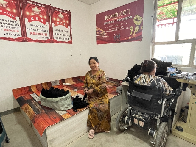 今年33歲的阿瓦漢·買買提和她的母親分工協(xié)作,每天收入大約150元。記者到訪時,她們正有條不紊地進(jìn)行著縫頭、翻襪、定型等織襪后道工序工作。