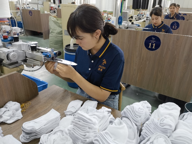 朱力姑·阿布拉沒成想,沒有投入一分錢,只出員工和場地,僅收取生產(chǎn)管理費(fèi)每年就多了5萬元。她將家中的蔬菜大棚改成棉襪生產(chǎn)車間,而定型機(jī)、縫投機(jī)、襪版、臺桌等設(shè)備安裝、生產(chǎn)用電等均由企業(yè)提供,自己只需叫上左鄰右舍的姐妹們加入,企業(yè)提供崗前培訓(xùn),并由老師傅傳幫帶。隨著用工熟練程度不斷加深,姐妹們從最初的人均月收入1500元增加到現(xiàn)在的人均月收入3500元不等。