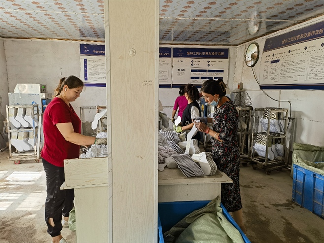 位于新疆生產(chǎn)建設(shè)兵團(tuán)第三師51團(tuán)4連圖木休克鎮(zhèn)的朱力姑·阿布拉家,15位維吾爾族女性按照縫頭、翻襪、定型等流水線有條不紊地進(jìn)行著棉襪后道工序生產(chǎn)。