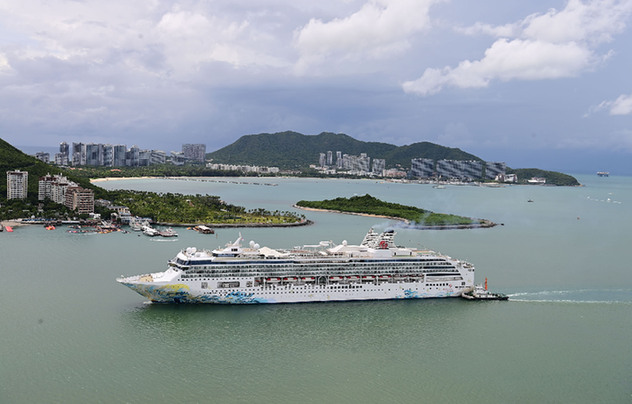 9月25日,發自香港、搭載1800多名旅客的“名勝世界壹號”郵輪順利靠泊三亞國際郵輪港碼頭,標志著三亞口岸國際郵輪航線正式復航。圖為當日“名勝世界壹號”郵輪緩緩駛進三亞港。