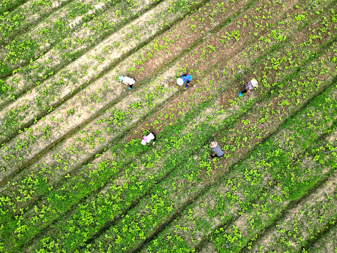 秋日里,農民忙著秋收秋管,鄉村田野一派繁忙景象。圖為9月26日村民在貴州省黔東南苗族侗族自治州榕江縣車江壩區蔬菜基地進行田間管理(無人機照片)。