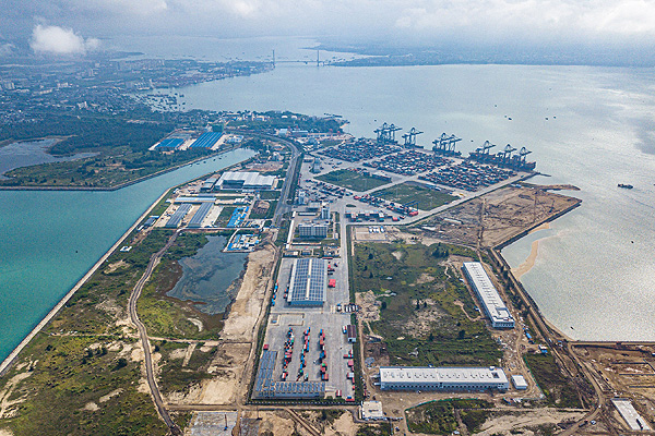 10月25日拍攝的洋浦港封關運作項目和洋浦國際集裝箱碼頭(無人機照片)。《海南自由貿易港建設總體方案》明確,海南將在2025年前適時啟動全島封關運作。目前,項目土建工程即將完工,工人們正在進行水電安裝等施工。
