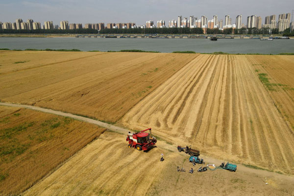 5月29日,在安徽蚌埠市五河縣朱頂鎮(zhèn)淮河岸邊,村民將收割的小麥裝車(chē)(無(wú)人機(jī)照片)。