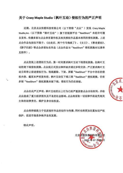 7月25日,點眾科技首先發布聲明稱,ReelShort平臺未經授權上線其擁有著作權的多部劇集,包括《出走后,兩個竹馬悔瘋了》《女王》《尊老愛幼》《游子歸家》等。盡管公司已多次發函交涉并要求下架侵權內容,楓葉互動僅下線了三部作品,其余涉嫌侵權內容仍在播放。