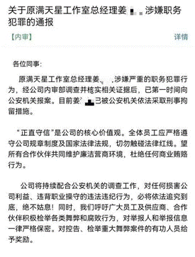 7月30日,有消息稱,中手游(00302.HK)發(fā)布內(nèi)部通報(bào),旗下原滿天星工作室總經(jīng)理姜某某因涉嫌嚴(yán)重職務(wù)犯罪,已被公安機(jī)關(guān)依法采取刑事拘留措施,案件正在進(jìn)一步偵辦中。