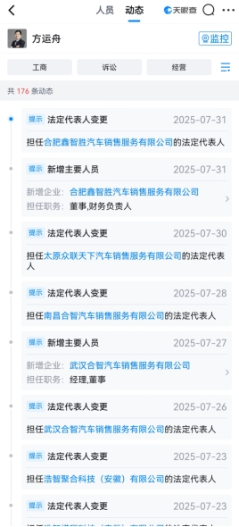 同時,記者注意到,天眼查App顯示,近期,合眾新能源董事長方運舟出任哪吒汽車旗下多家公司的法定代表人,涉及合肥鑫智勝汽車銷售服務有限公司、浩智聚合科技(安徽)有限公司、浩智增程科技(安徽)有限公司、浩智科技電驅(桐城)有限公司、??诒娐撎煜缕囦N售服務有限公司、深圳紛石汽車銷售服務有限公司等多家公司。