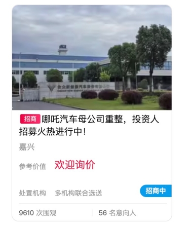 阿里拍賣平臺顯示,截至發稿前,哪吒汽車母公司重整投資人招募已有56名意向人,超9600次圍觀。