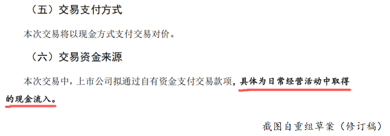 記者注意到,重組草稿(修訂稿)對“交易資金來源”進行了補充披露,將“自有資金支付”具體為“日常經營活動中取得的現金流入”。
