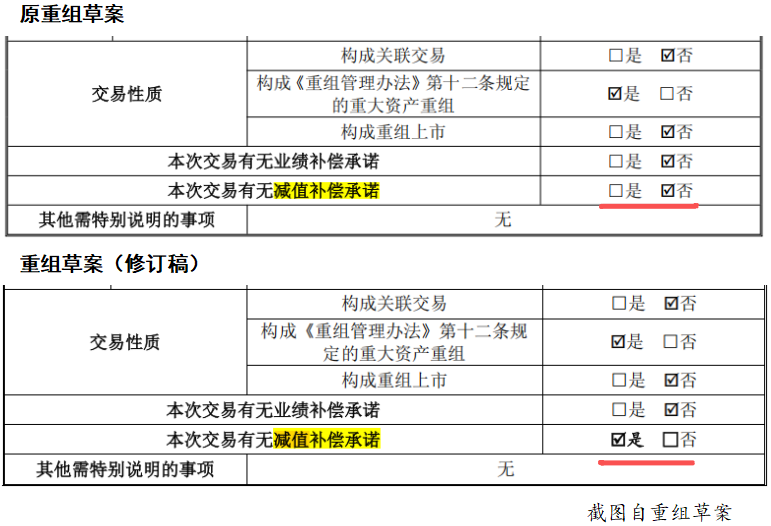 對比前后兩份重組草案,重組草稿(修訂稿)增加了“減值補償承諾”。