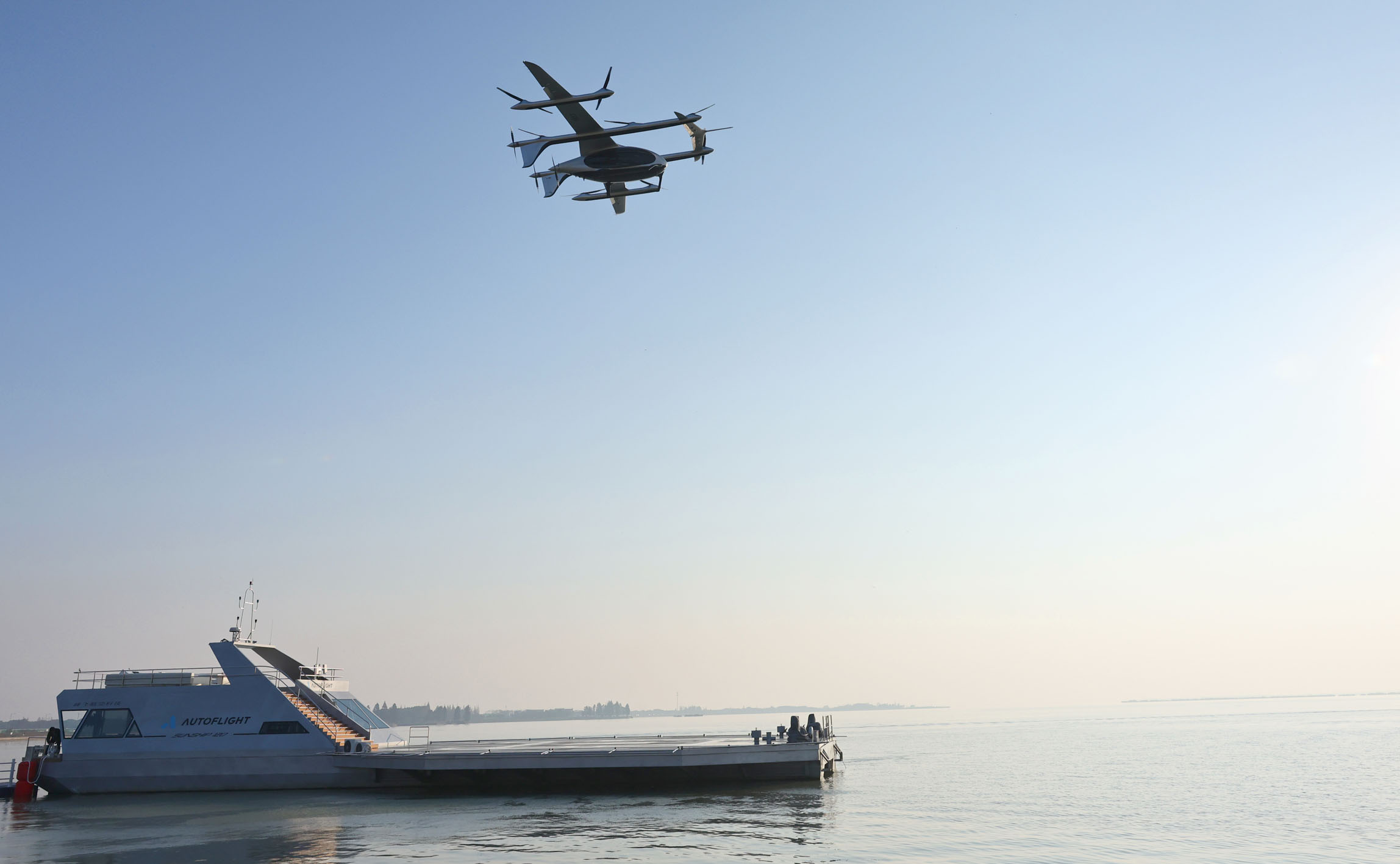 11月22日,一架電動(dòng)垂直起降飛行器從零碳水上機(jī)場起飛。新華社記者 方喆 攝