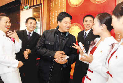 3月2日,農(nóng)民工全國人大代表、重慶城建集團農(nóng)工班班長康厚明(中)來到北京一家重慶餐館,征求重慶籍外來工的意見。會上,他將就農(nóng)民工醫(yī)療、工傷保險等問題提出相關(guān)建議。
