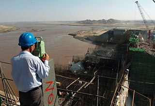 | 2007年10月22日,一名中國工人在蘇丹首都喀土穆以北的麥羅維大壩施工現場進行測量。麥羅維大壩由中國水利電力對外公司和中國水利水電建設集團公司承建,是迄今為止中國企業承包的最大國際工程,也是蘇丹乃至非洲目前在建的最大水電項目。新華社記者
