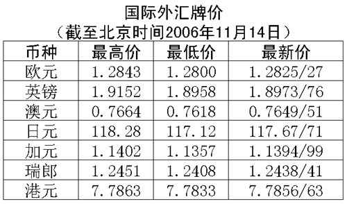 根據中國人民銀行授權中國外匯交易中心發布的公告,2006年11月14日銀行間外匯市場美元等交易貨幣對人民幣匯率的中間價為:1美元兌人民幣7.8703元,1歐元兌人民幣10.0824元,100日元兌人民幣6.6822元,1港幣兌人民幣1.01098元,1英鎊兌人民幣14.9739元。