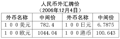 根據中國人民銀行授權中國外匯交易中心發布的公告,2006年12月4日銀行間外匯市場美元等交易貨幣對人民幣匯率的中間價為:1美元兌人民幣7.8240元,1歐元兌人民幣10.4404元,100日元兌人民幣6.7875元,1港幣兌人民幣1.00643元,1英鎊兌人民幣15.4992元。