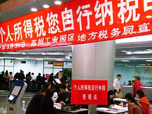 市民在蘇州工業(yè)園區(qū)地稅局申報(bào)個(gè)稅。新華社發(fā)(李俊鋒