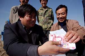 春耕時(shí)節(jié),甘肅省臨洮縣農(nóng)村信用社信貸員將信貸資金送到新添鎮(zhèn)劉家溝門(mén)村村民(右)手中。 新華社記者 聶建江