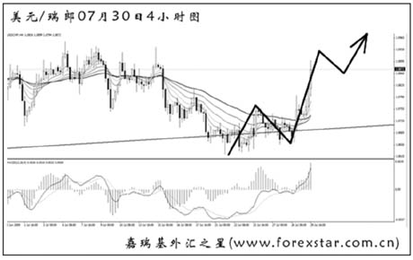 ▲美元兌瑞郎在小幅跌破了旗型下沿之后轉身發力上行,中線看空的思路需暫緩。從波浪角度分析,目前美瑞處于3浪上漲中,后市還有第5浪的上沖。下周美瑞重新向1.1000上方發起沖擊的希望較大。